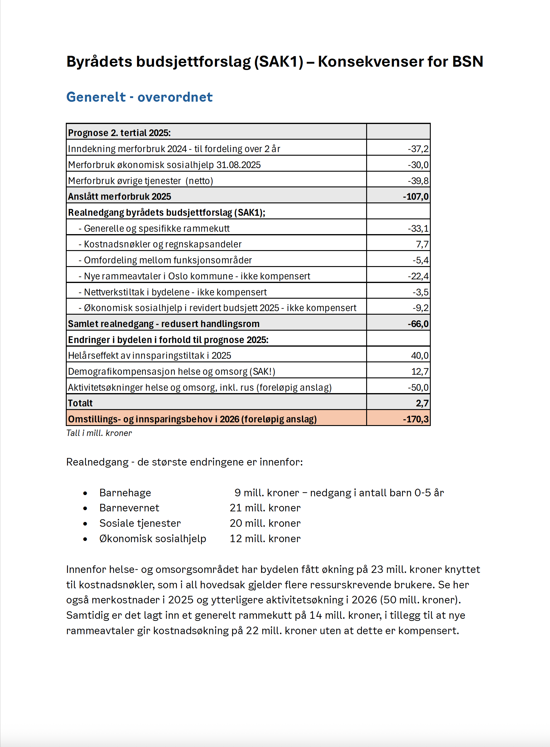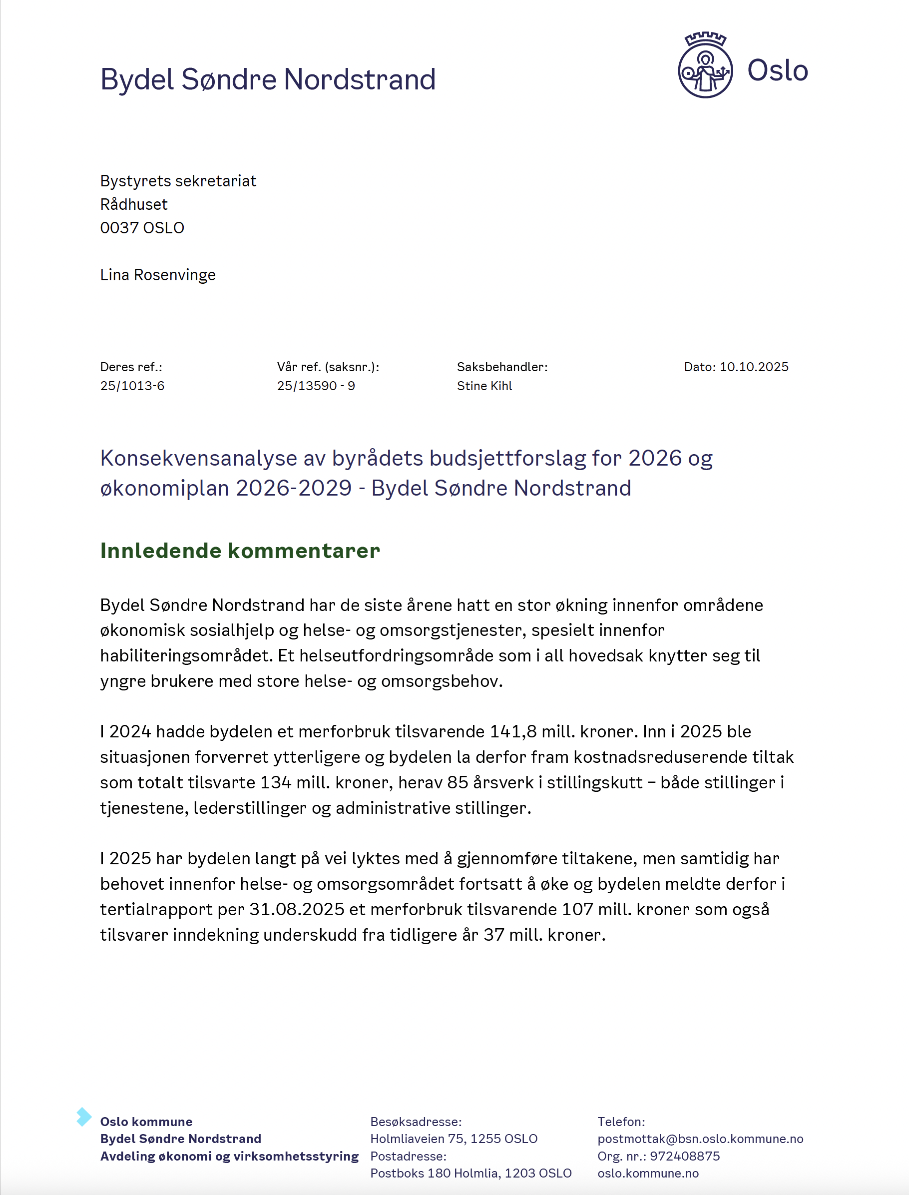 Dette er altså oversikten Bydel Søndre Nordstrand ikke vil du skal se: Et budsjett som varsler flere kutt, færre ansatte og svekkede tjenester — i en bydel som allerede sliter med store sosiale og økonomiske utfordringer.